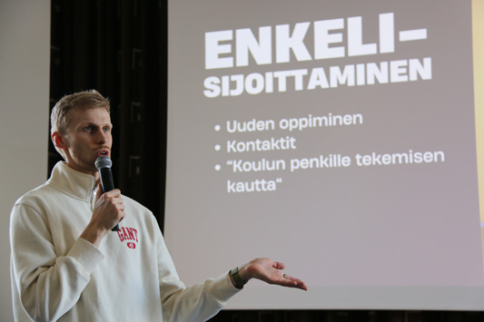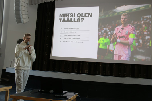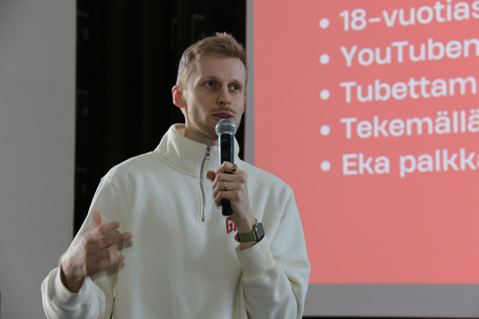 Vuoden munkkalainen, kauppatieteiden kandidaatti, tubettaja ja yrittäjä, Roni Bäck vieraili koulullamme perjantaina 17.4.2026. Kello 9 alkavalla tunnilla hän piti esityksen koulumme lukiolaisille ja peruskoulun yhdeksännelle luokalle, kertoen urapolustaan ja ammatistaan. Toisessa esityksessä yleisönä olivat peruskoulun 7.- ja 8.- luokat.