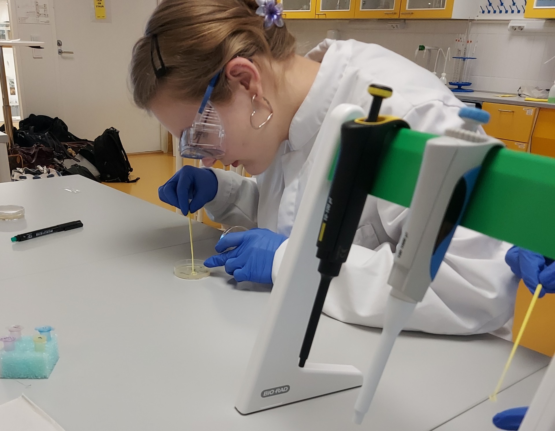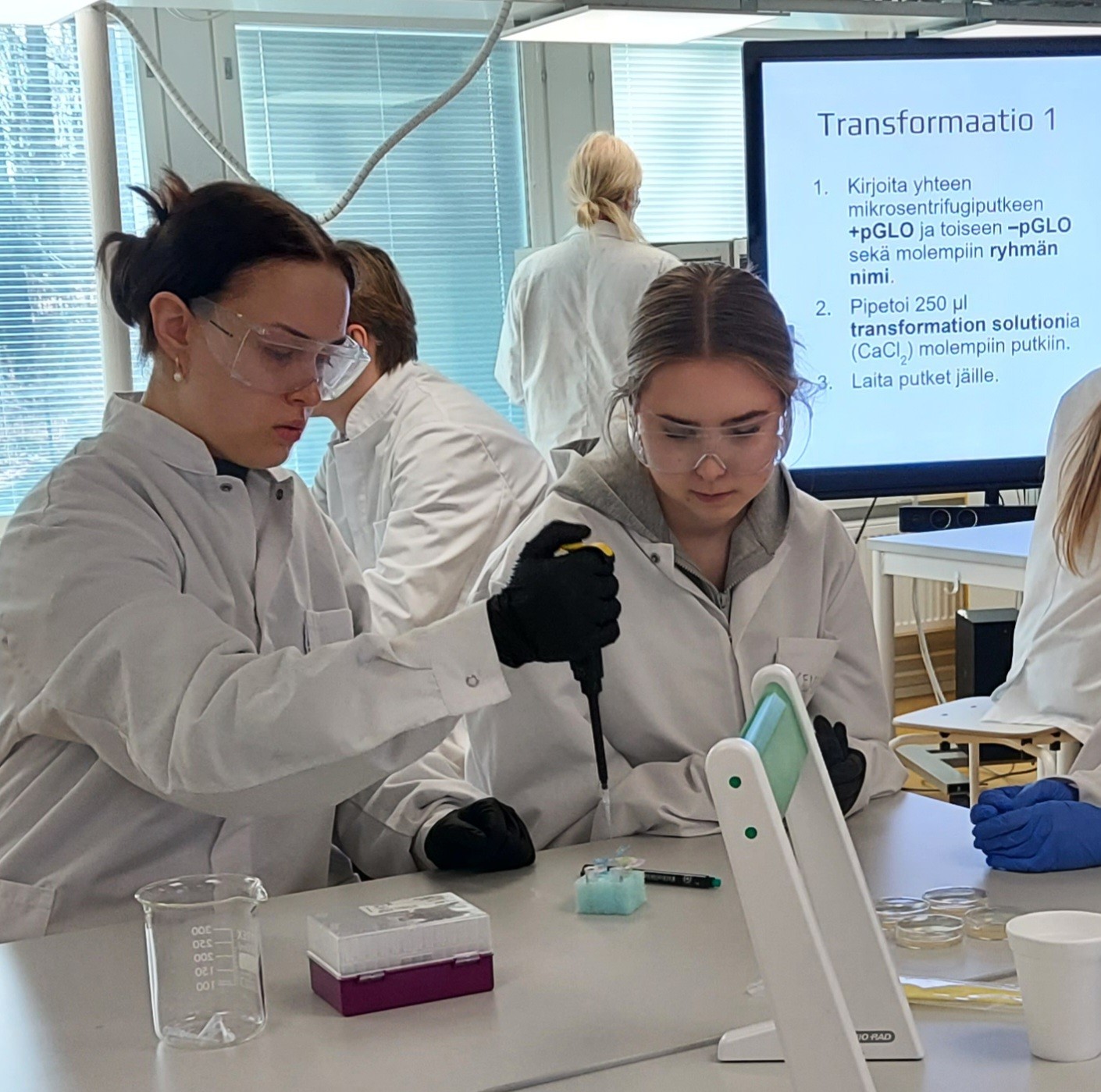 Luonnontiedelinjalaiset pääsivät tekemään geenisiirtoa Otaniemen lukiossa. Teoreettinen geenitekniikka saatiin käytännön tasolle. Hieno ja opettavainen aamupäivä.