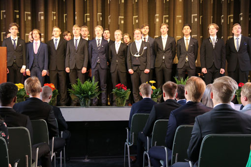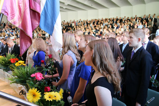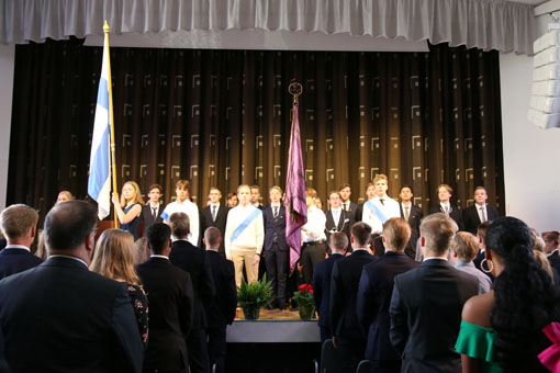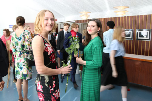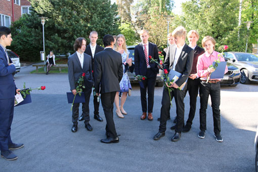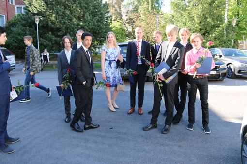 Munkkiniemen yhteiskoulussa vietettiin peruskoulun kevätjuhlaa lauantaina 1.6.2019. Juhlassa yhdeksäsluokkalaiset peruskoulunsa päättävät oppilaat kukitettiin todistusten jaon yhteydessä.