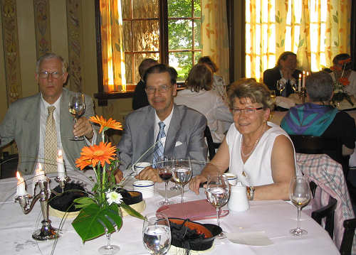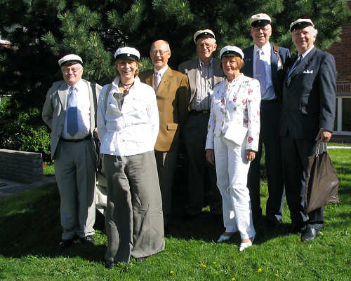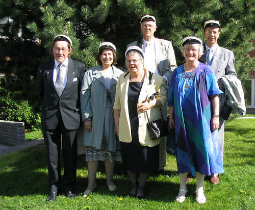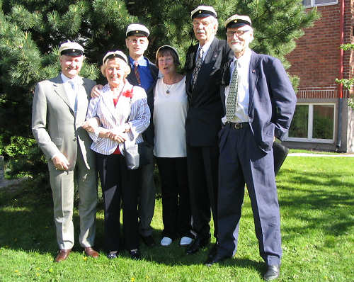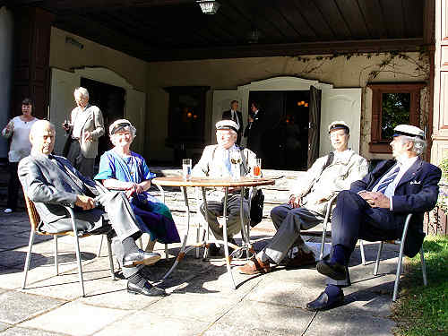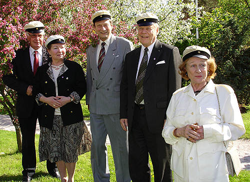 Aivan upea, lämmin, aurinkoinen sää sekä ihastuttava Fiskiksen puisto houkuttelivat juhlijoita pihalle pienille alkudrinkeille. Pöydän ympärillä vasemmalta: Pertti Seeve, Ulla Virkkunen, Erkki Airaksinen, Ilkka Salomaa ja Heikki Mäntylä. |