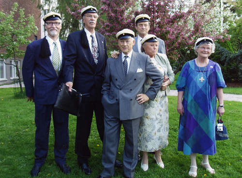 Kuvassa vasemmalta Tero Kangas, Sirkka Stephens (Seppälä), Anneli Heinonen-Kuukka ja Ulla Virkkunen (Emaus) – takana Juhani Tuomarla ja Ilkka Salomaa. Mikäpä oli hymyillessä kun aurinko helli ja kevätkesä oli heleimmillään. |