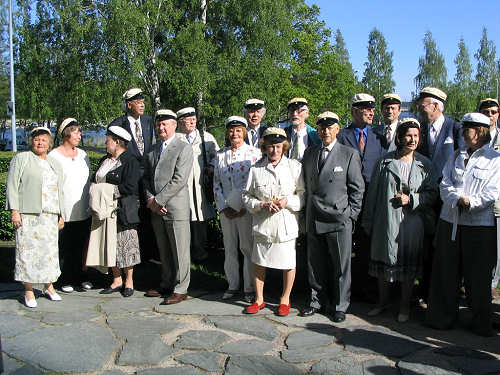 aamuilla turhan pitkäksi! Kesäkuun 3. päivänä koululla vietettiin virallista lakkiaisjuhlaa ja 125 uutta ylioppilasta sai vitivalkoiset lakkinsa. Juhlineita luokkalaisiamme tässä juhlassa edusti 10 hengen delegaatio ”keltahattuisia”. Ekonomi Pertti Seeve esitti joukkomme puolesta tervehdyksen ja onnittelut kevään uusille ylioppilaille. | |