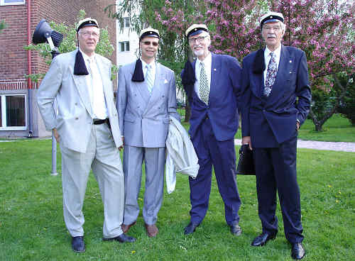 Muutamat A-luokan herrat dipl.-insinöörit halusivat ihan omaan kuvaan ikuistaakseen tupsulakkisuutensa! Vasemmalta Juhani Tuomarla, Ilkka Salomaa, Paavo Suhonen ja Jorma Hintikka. |