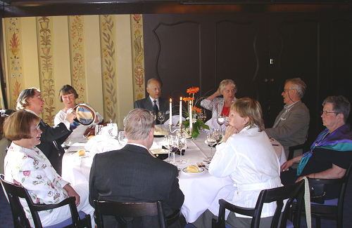 Tyylikkään illallisen nautimme Fiskiksen Katariina-kabinetissa, mutta illan tässä vaiheessa oli tunnelma jo niin korkealla ja lämmin, että paljon kokeneet ja nähneet yo-lakit oli pakko ottaa pois päästä muissakin pöydissä – lakit kelpasi-vat sentään vielä pöytäkoristeiksi! |